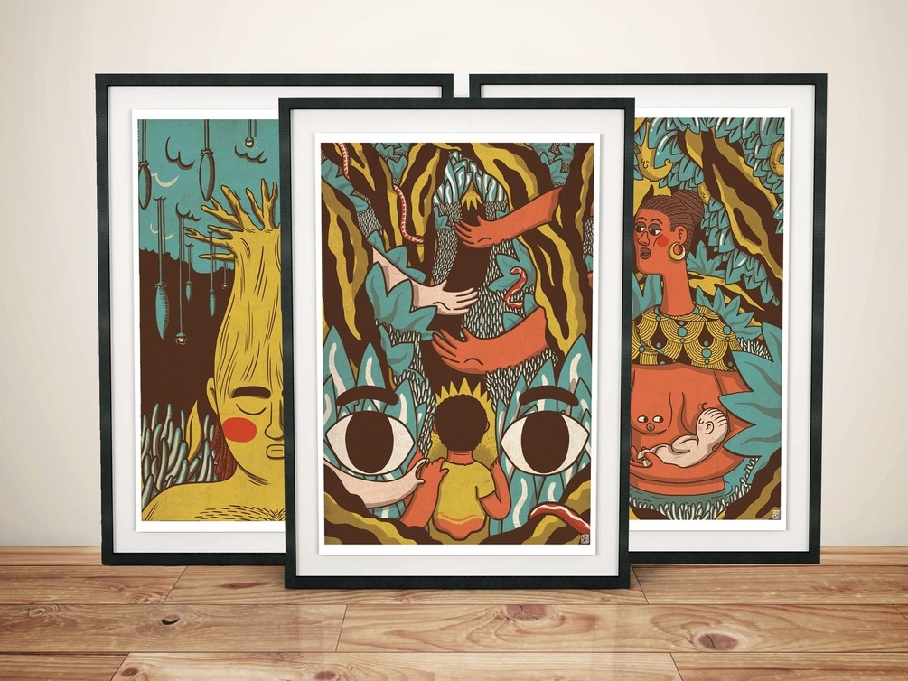 3 different illustrations (Baobab treeman - Road of life - Breastfeeding)